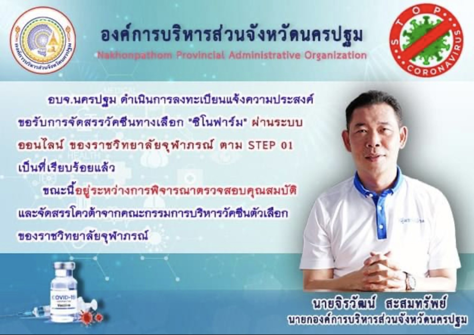 นายกอบจ.นครปฐมสั่งจอง'ซิโนฟาร์ม'