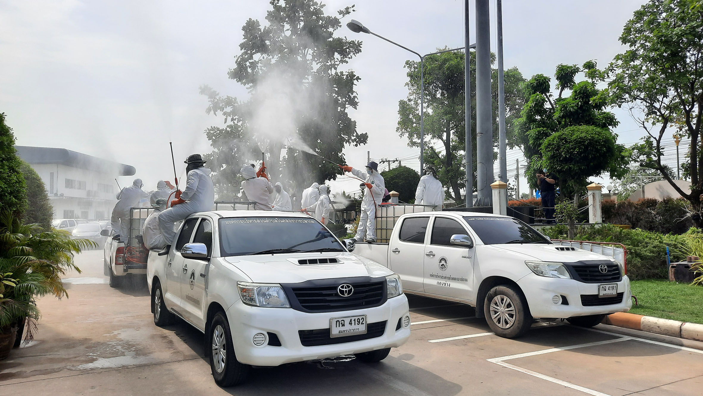 สมุทรปราการ-อบต.ในคลองบางปลากดจัดทัพใหญ่ปล่อยขบวนรถพ่นยาฆ่าเชื้อและเจ้าหน้าที่นับร้อยลุยสกัดโควิค-19
