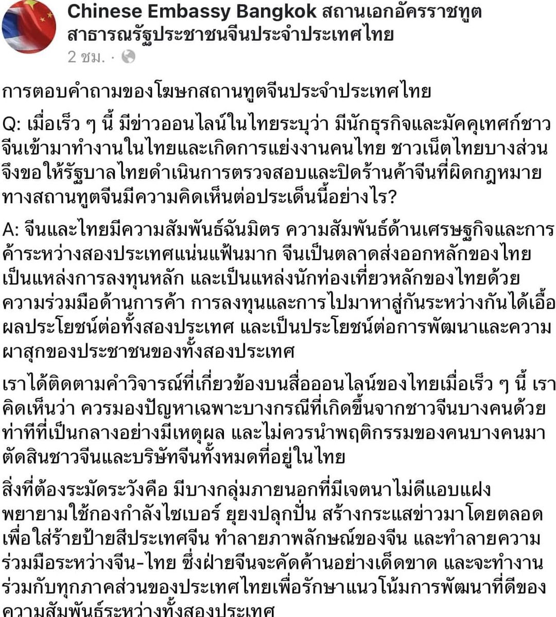 ประมวลคำชี้แจ้งของสถานเอกอัครราชทูตสาธารณรัฐประชาชนจีนประจำประเทศไทยในประเด็นการเข้าใจผิดของคนไทยบางส่วนต่อกรณีคนจีนเข้า...