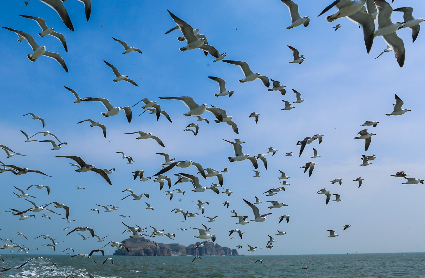 เมืองหรงเฉิงในซานตงช่วงฤดูใบไม้ผลิ พบนกนางนวลหางดำกว่า40,000 ตัว