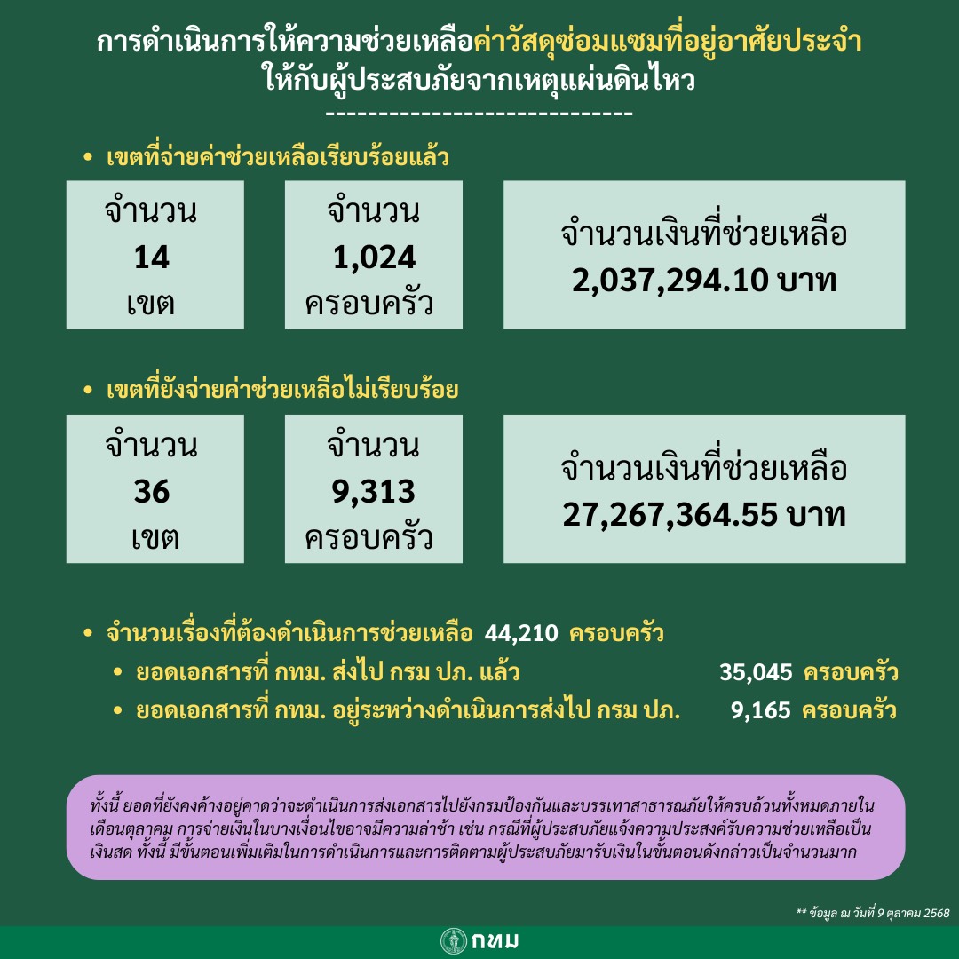 กรุงเทพฯ-กทม. - ปภ. เร่งจ่ายเงินเยียวยาผู้ประสบเหตุแผ่นดินไหวแล้วเสร็จภายใน ต.ค. นี้ แนะรับโอนผ่านระบบ KTB