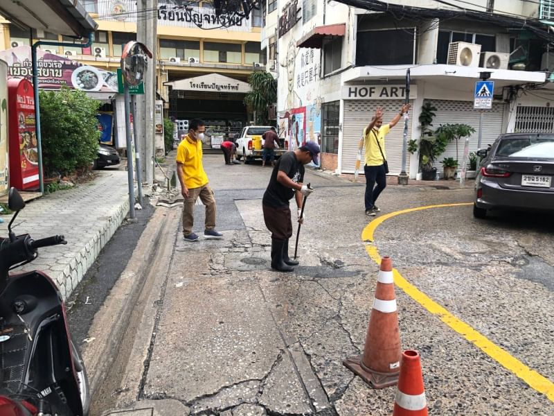 เขตดินแดงซ่อมผิวจราจรชำรุดที่ทางโค้ง หน้าโรงเรียนปัญจทรัพย์