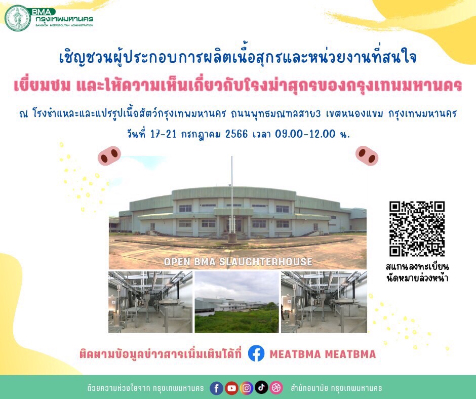 กรุงเทพฯ-ผู้บริหารกรุงเทพมหานคร จัดกิจกรรมเยี่ยมชมและให้ความเห็นเกี่ยวกับโรงฆ่าสุกรของกรุงเทพมหานคร ในวันที่ 17-21 ก.ค. ...