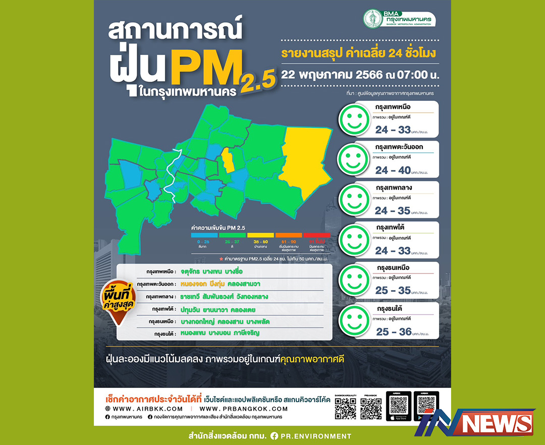 กรุงเทพฯ- ศูนย์ข้อมูลคุณภาพอากาศกรุงเทพมหานครขอสรุปผลการตรวจวัด PM2.5 วันที่ 22 พฤษภาคม 2566 เวลา 05.00-07.00 น. (3 ชั่ว...