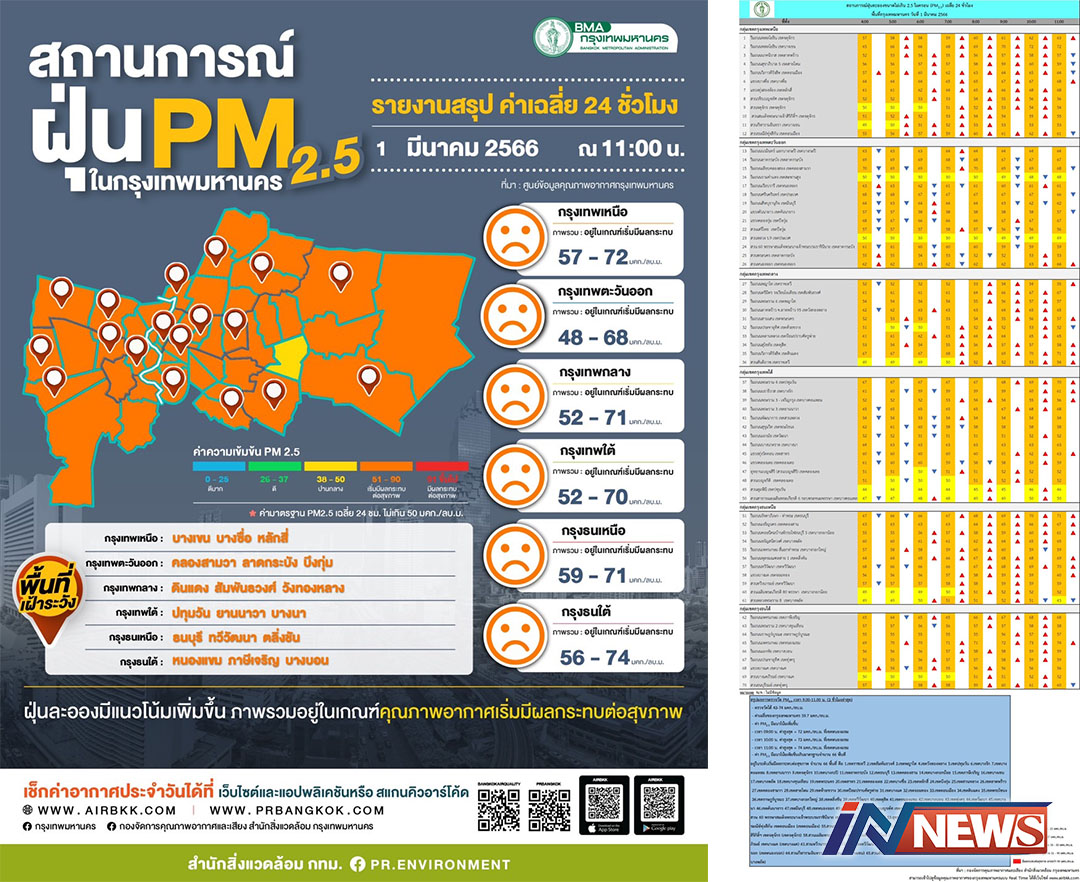 กรุงเทพฯ-ศูนย์ข้อมูลคุณภาพอากาศกรุงเทพมหานครขอสรุปผลการตรวจวัด PM2.5 วันที่ 1 มี.ค. 2566 เวลา 9.00-11.00 น. (3 ชั่วโมงล่...