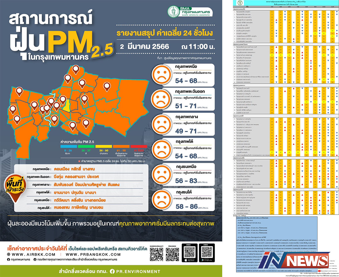 กรุงเทพฯ-ศูนย์ข้อมูลคุณภาพอากาศกรุงเทพมหานครสรุปผลการตรวจวัด PM2.5 วันที่ 2 มี.ค. 2566 เวลา 9.00-11.00 น. (3 ชั่วโมงล่าส...