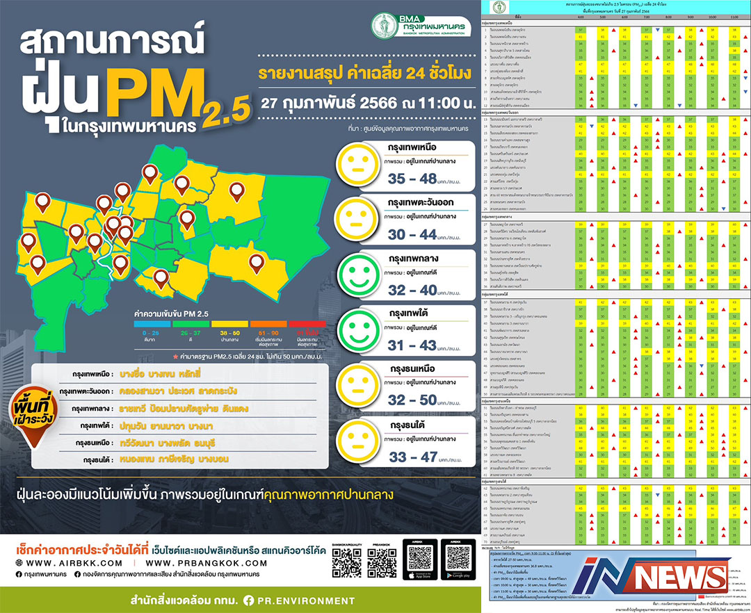กรุงเทพฯ-ศูนย์ข้อมูลคุณภาพอากาศกรุงเทพมหานครสรุปผลการตรวจวัด PM2.5 วันที่ 27 ก.พ. 2566 เวลา 05.00-07.00 น. และ เวลา...