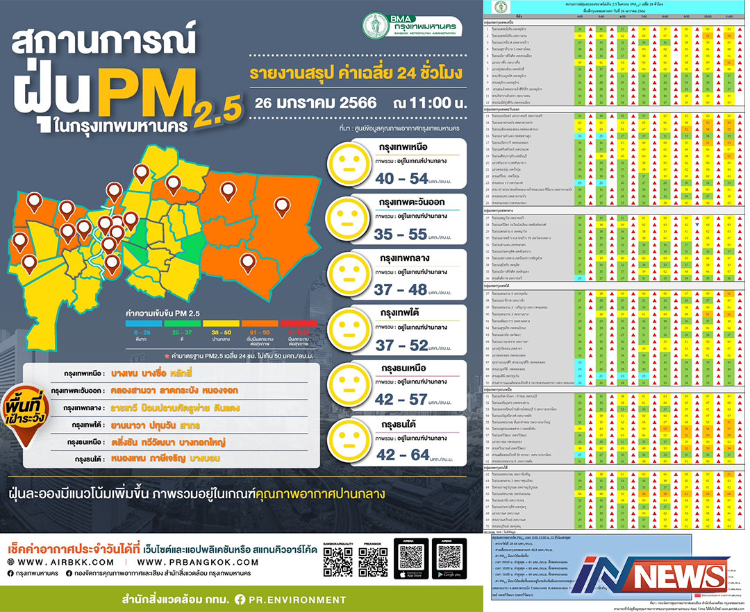 กรุงเทพฯ-ผลการตรวจวัด PM2.5 วันที่ 26 มกราคม 2566 เวลา 9.00-11.00 น. (3 ชั่วโมงล่าสุด) ศูนย์ข้อมูลคุณภาพอากาศกรุงเทพมหาน...