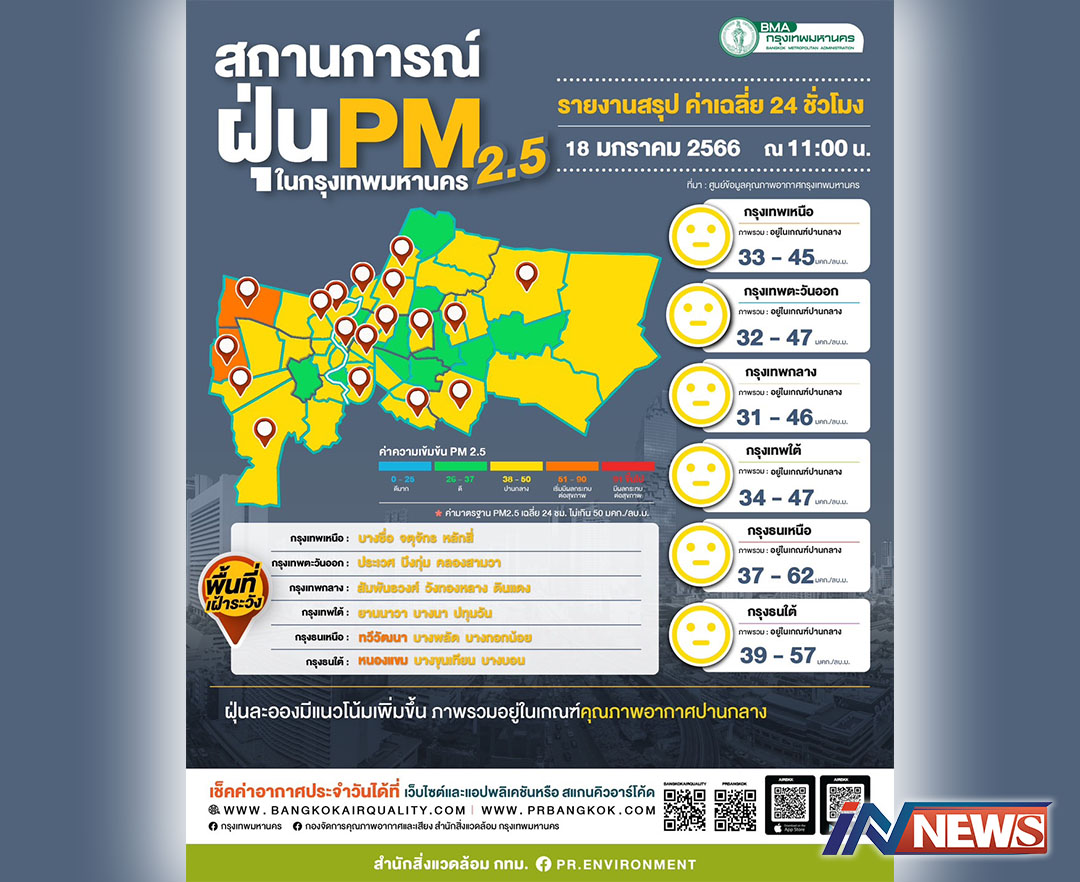 กทม.วันนี้เตือนภัยฝุ่นPM2.5มีเกิน4พื้นที่ ระวังชายขอบฝั่งธน/เผยมีแนวโน้มลดลง