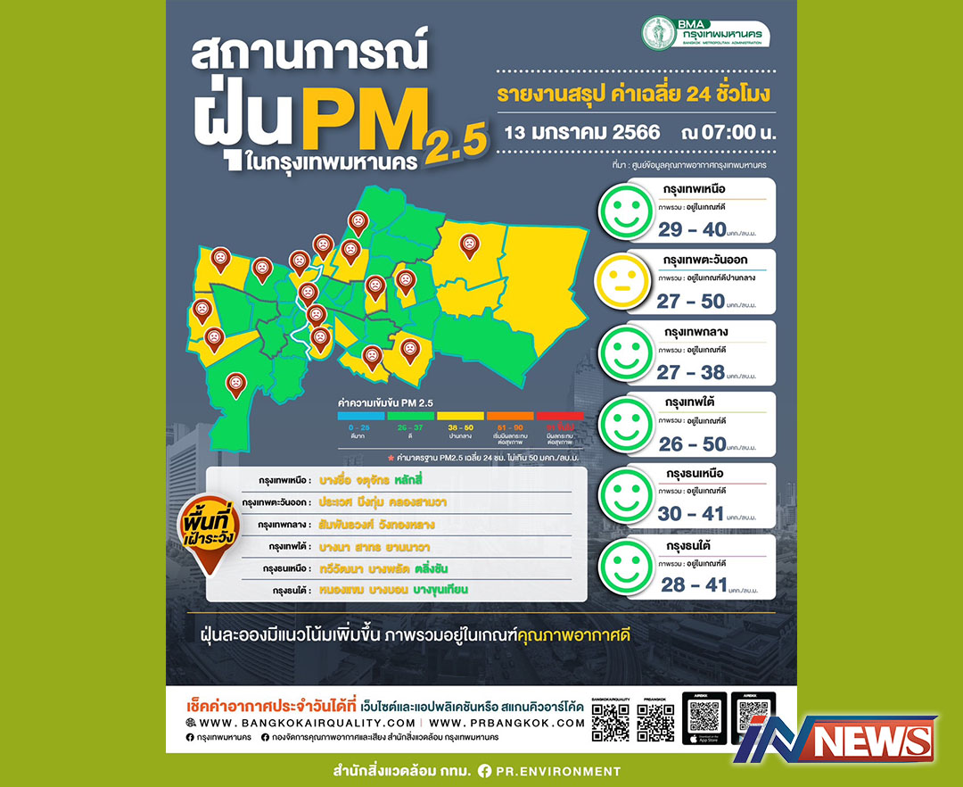 กรุงเทพฯ-เช้านี้ค่าฝุ่นมีแนวโน้มเพิ่มขึ้น แต่ยังอยู่ในเกณฑ์มาตรฐานผลการตรวจวัด PM2.5 วันที่ 13 มกราคม 2566 เวลา 05.00-07...