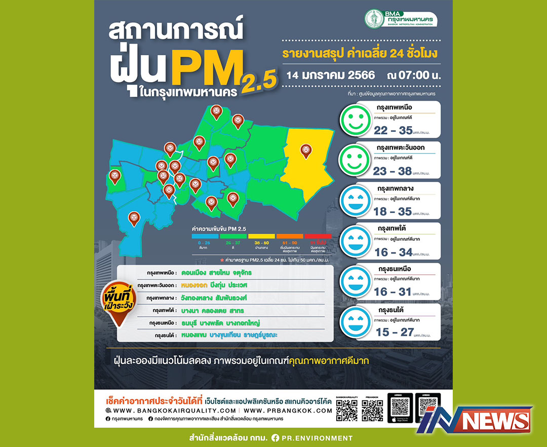 กรุงเทพฯ-เช้านี้ค่าฝุ่นมีแนวโน้มลดลงและอยู่ในเกณฑ์มาตรฐานผลการตรวจวัด PM2.5 วันที่ 14 มกราคม 2566 เวลา 05.00-07.00 น. โด...