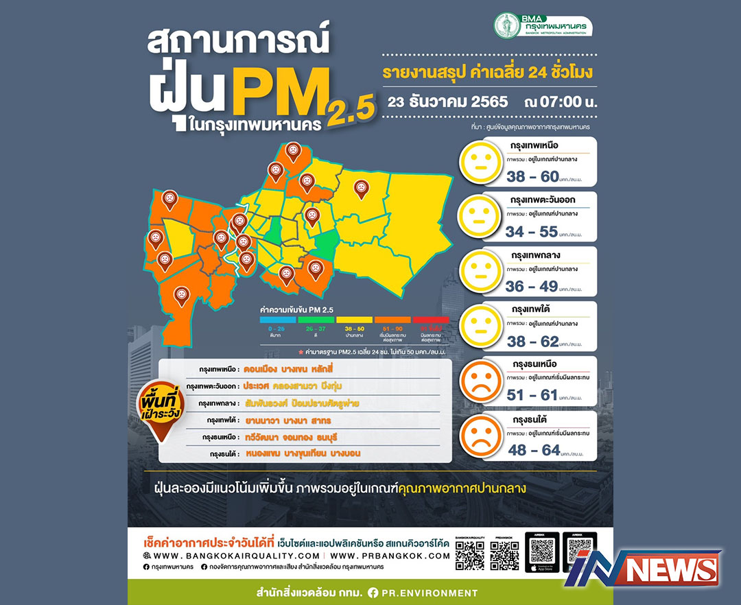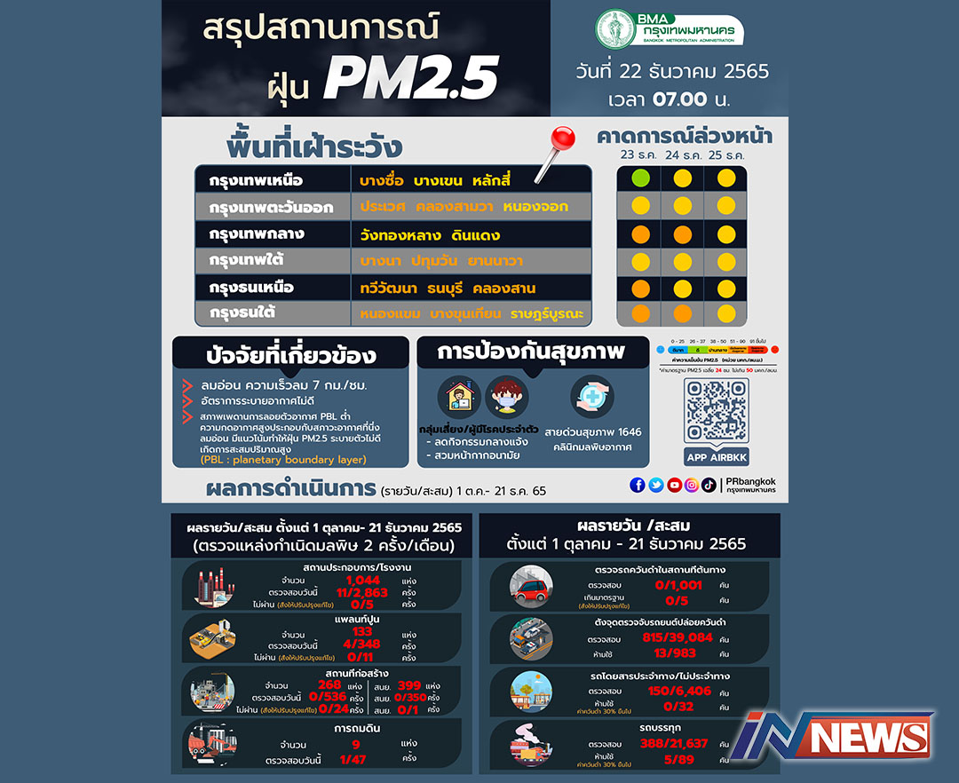 กรุงเทพฯ-สำนักสิ่งแวดล้อม รายงานฝุ่นละออง PM2.5 ในพื้นที่กรุงเทพฯและปริมณฑลวันที่ 22 ธันวาคม 2565 มีค่าเกินมาตรฐาน ...