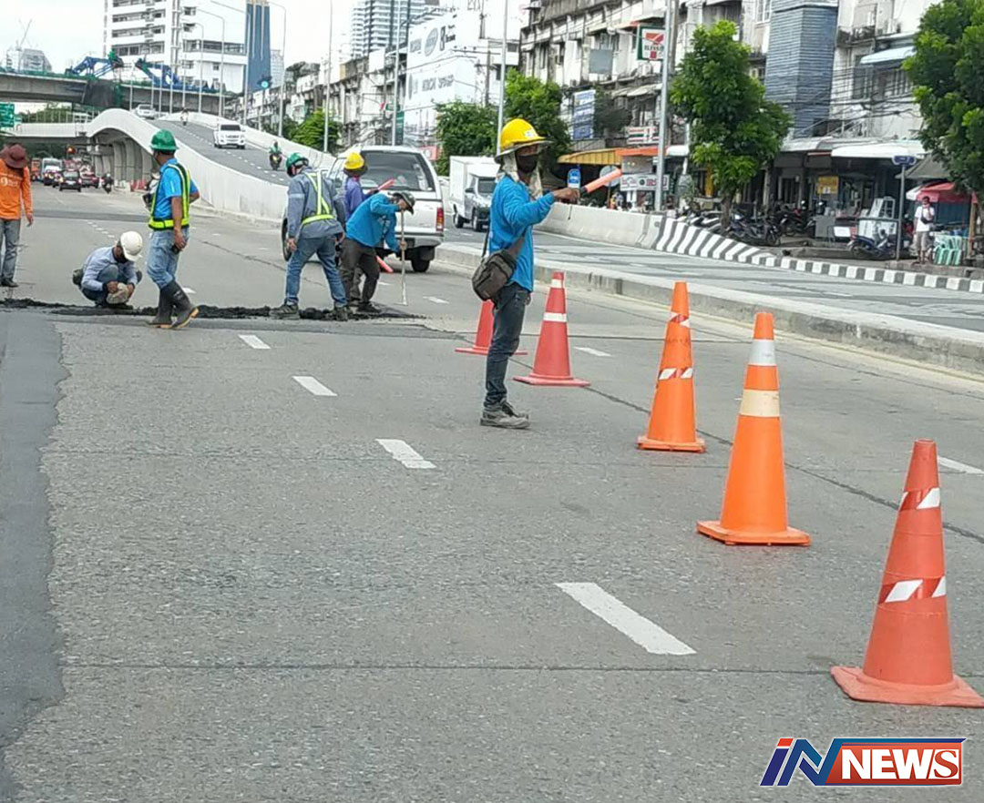 กรุงเทพฯ-สำนักงานเขตคลองเตยและสำนักการโยธา กทม.แจงเหตุปูนบนสะพานข้ามแยก ณ ระนอง - เร่งซ่อมผิวจราจรติดตั้งสะพานลอยคนข้าม