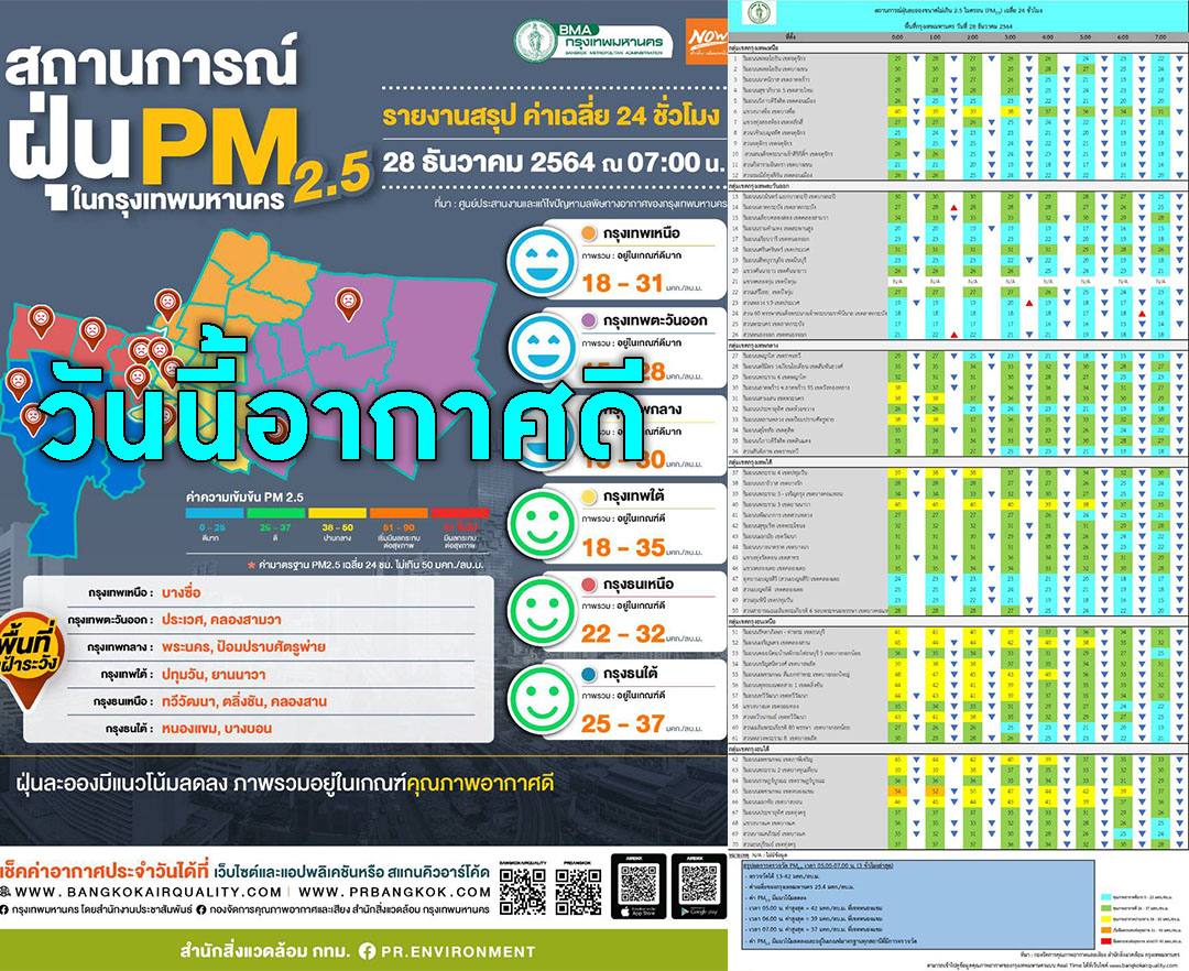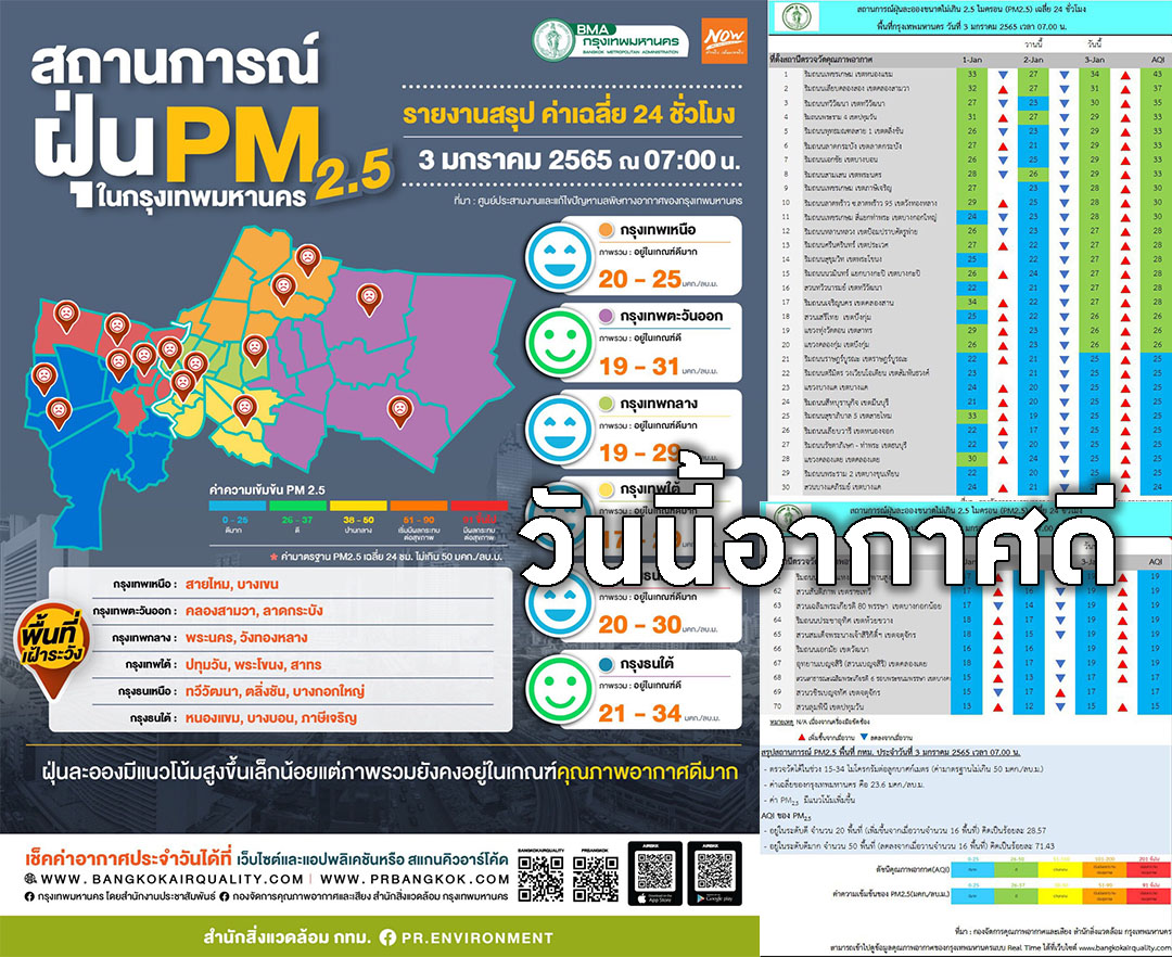 วันนี้พื้นที่กทม.ท้องฟ้าโปร่งอากาศดีมาก ค่าฝุ่นPM2.5ไม่เกินมาตรฐาน