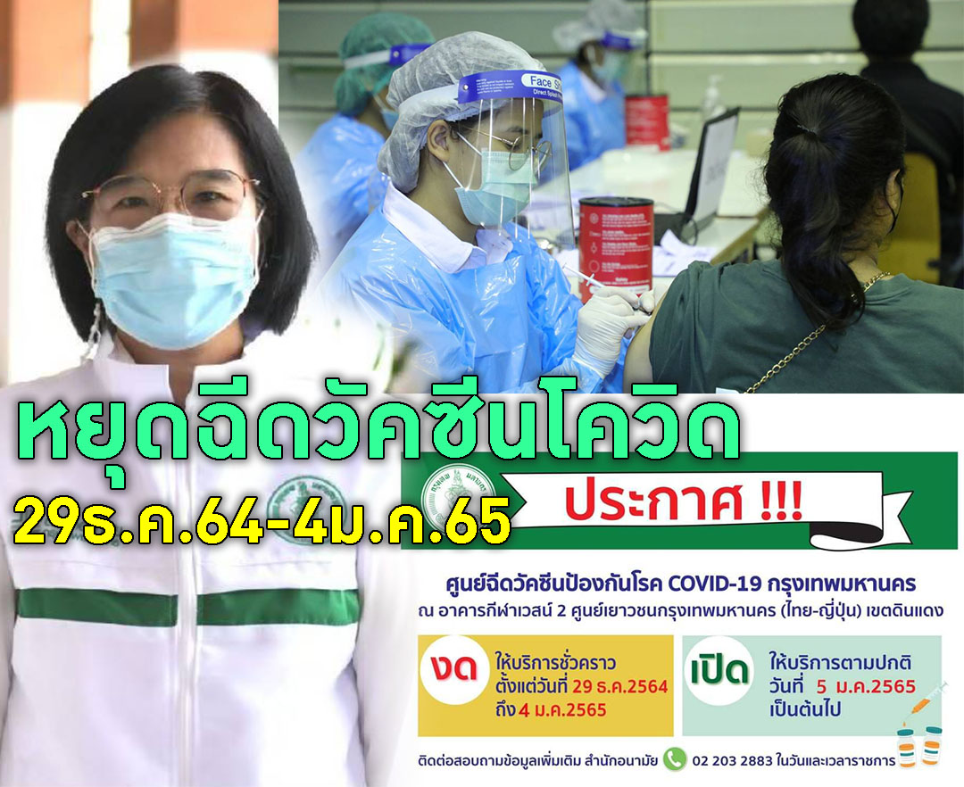 กรุงเทพฯ-สำนักอนามัย กทม.เผยศูนย์ฉีดวัคซีนโควิด-19 กทม. หยุดให้บริการช่วงเทศกาลปีใหม่ 29 ธ.ค. 64 – 4 ม.ค. 65