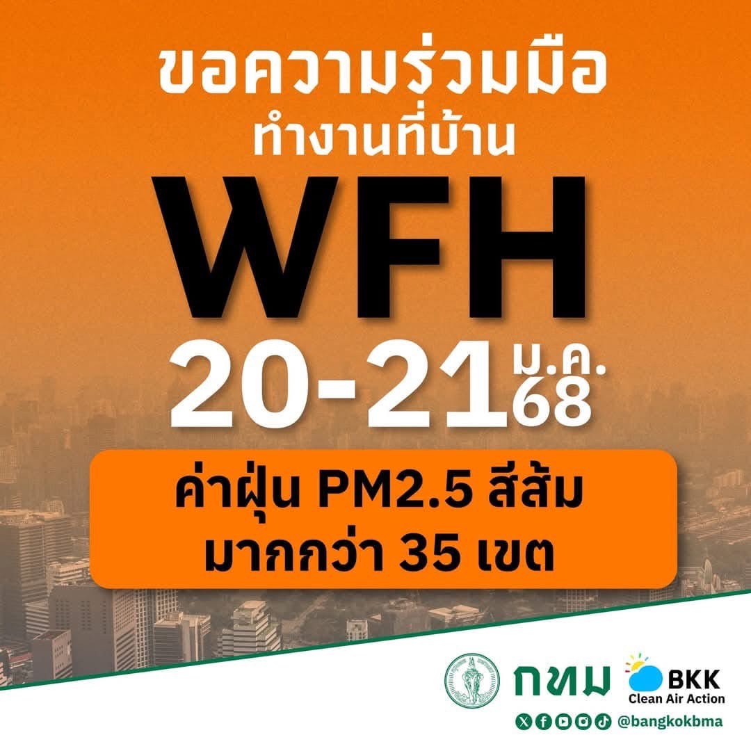 กรุงเทพฯ-หน่วยงานสังกัด กทม. ขานรับมาตรการ WFH 20-21 ม.ค. 68 ประชุมออนไลน์-เลื่อนงานวิ่ง หวังลด PM2.5 และอันตรายต่อสุขภา...