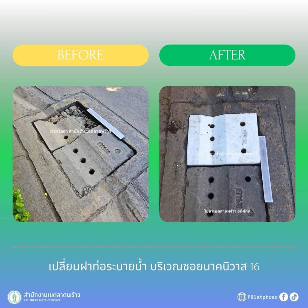 เขตลาดพร้าวลงพื้นที่ซ่อมขอบบ่อ-เปลี่ยน ฝาท่อระบายน้ำในซอยนาคนิวาส16