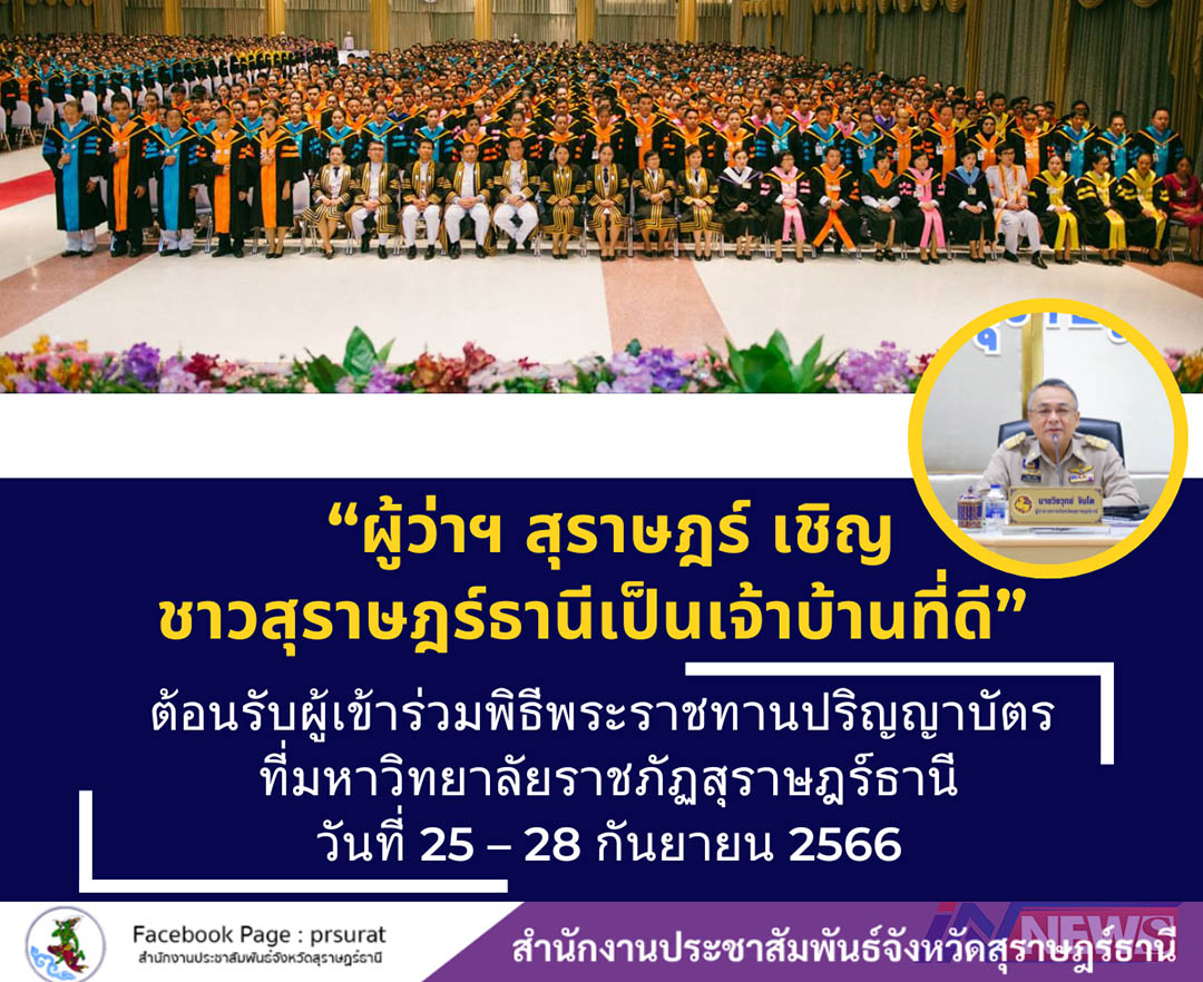 สุราษฏร์ธานี-ผู้ว่าฯ สุราษฎร์ เชิญชวน ชาวสุราษฎร์ธานีเป็นเจ้าบ้านที่ดี ต้อนรับบัณฑิตและครอบครัว ที่จะมาร่วมพิธีพระ...