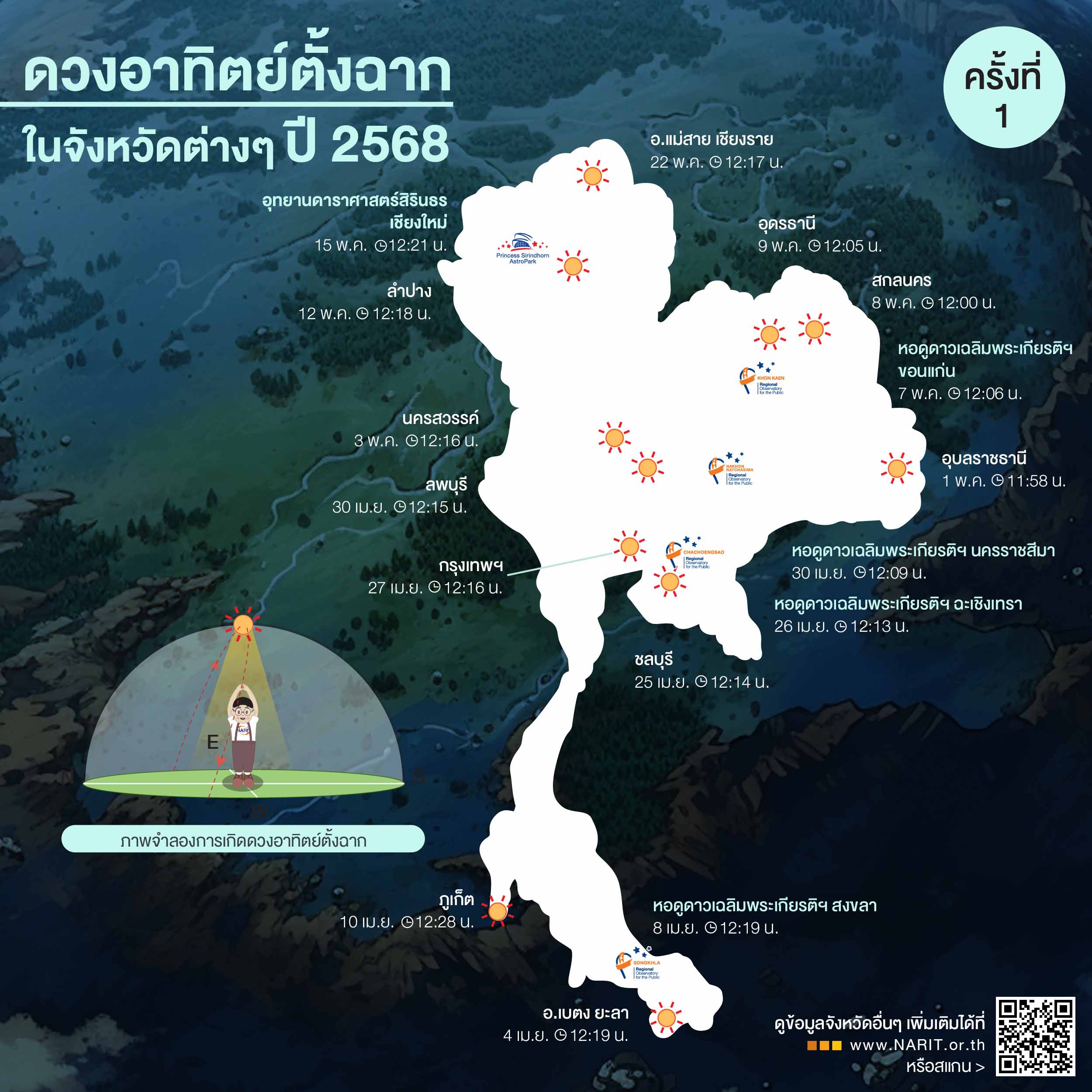 ปราจีนบุรี-เปิดไทม์ไลน์ ดวงอาทิตย์ตั้งฉาก 77 จังหวัดของไทยปี 2568เริ่มที่ อ. เบตง จ. ยะลา 4 เมษายนนี้เริ่มจากทางใต้สุดที...