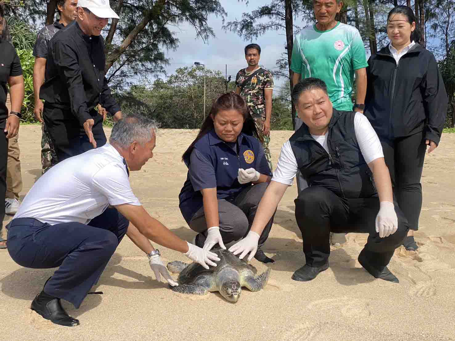 พังงา-นายอำเภอร่วมกับอุทยานฯ ปล่อยเต่าหญ้าคืนสู่หาดท้ายเหมือง หลังพบบาดเจ็บเกยตื้นรักษาหายดีแล้ว