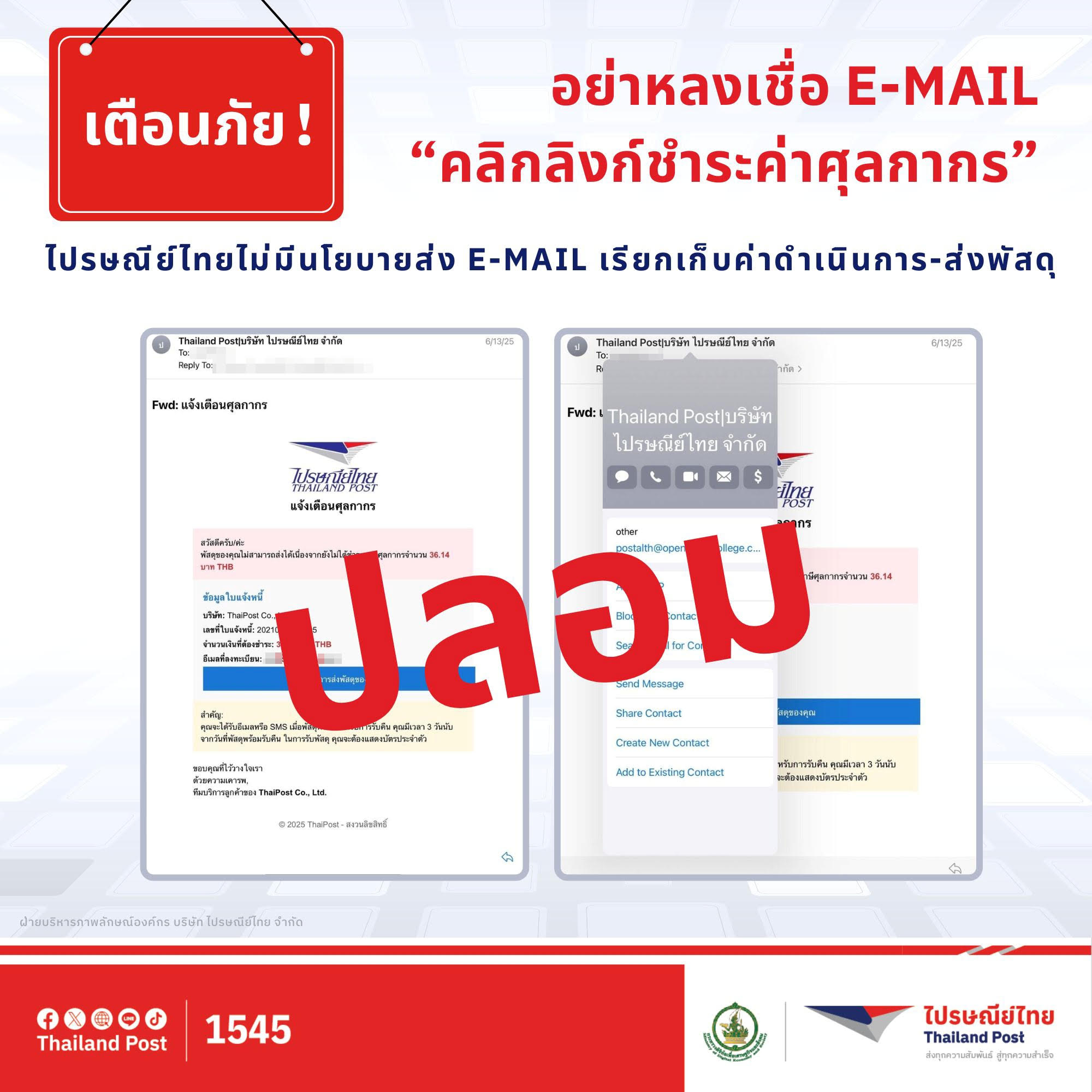 'ไปรษณีย์ไทย'เตือนอย่าหลงเชื่ออีเมลกด 'คลิกลิงก์ชำระค่าศุลกากร'