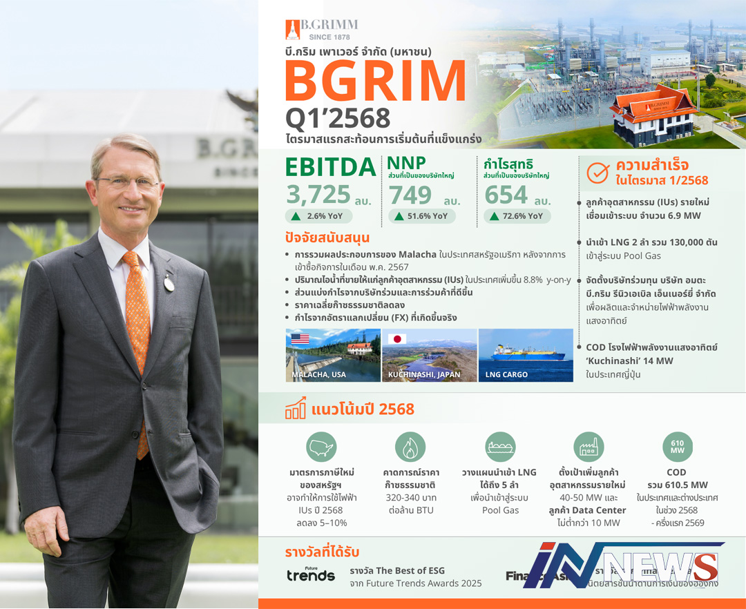 บี.กริมเพาเวอร์โชว์กำไรไตรมาส1/2568 โต51.6%พร้อมเดินหน้าขยายฐานลูก