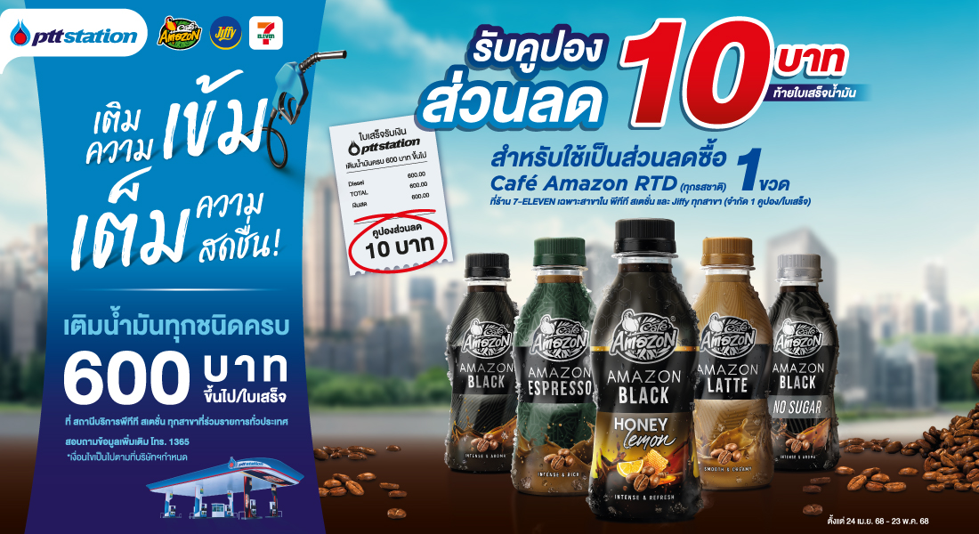 พีทีทีสเตชั่นรับคูปองส่วนลดกาแฟพร้อม ดื่มคาเฟ่อเมซอนไปเลย10บาท!