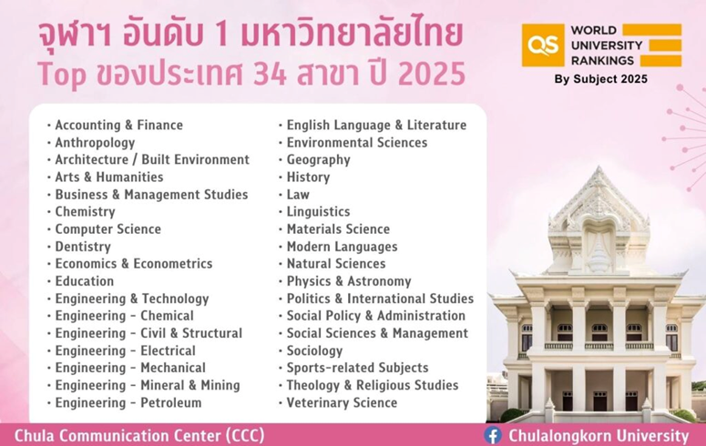 จุฬาฯอันดับ1มหา'ลัยไทยของประเทศ โดยQS University Rankings by Subject2025