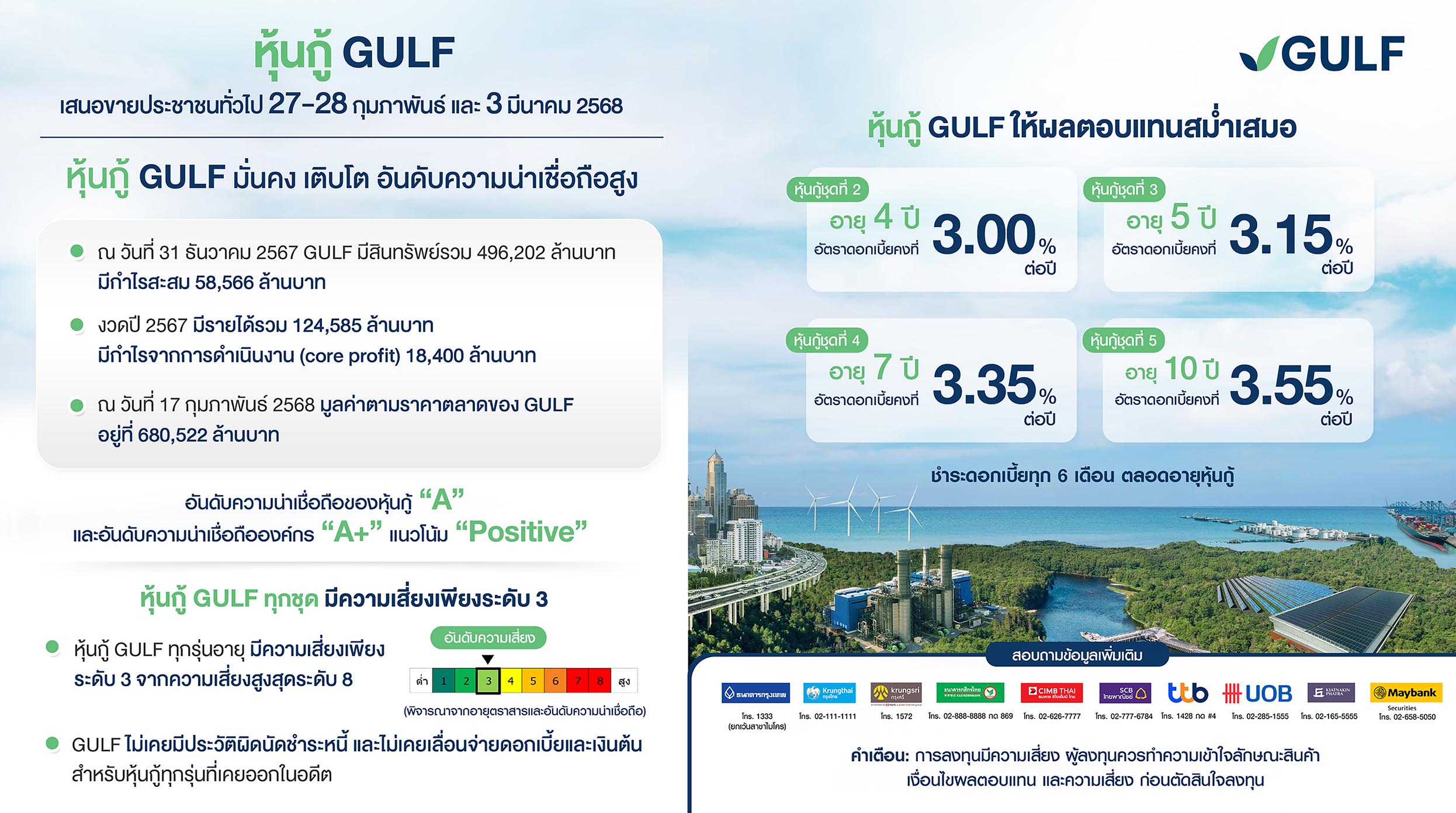 กรุงเทพฯ-GULF เสนอขายหุ้นกู้ระหว่างวันที่ 27 - 28 กุมภาพันธ์ และ 3 มีนาคม 2568&n...