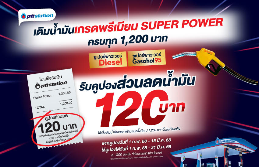แรงเต็มพลังกับเติมน้ำมันSuper Power พีทีทีสเตชั่นครบพันสองรับส่วนลด120บ.