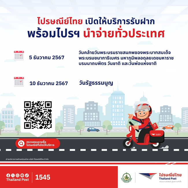 กรุงเทพฯ - 3 ธันวาคม 2567 บริษัท ไปรษณีย์ไทย จำกัด เปิดให้บริการรับฝากและนำจ่าย ตามปกติทั่วประ...