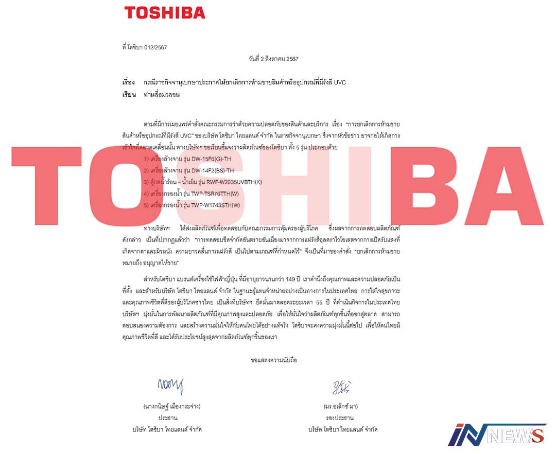 โตชิบาแจงกรณีห้ามขายสินค้ามีรังสียูวีซี ชี้ผลิตภัณฑ์ของบริษัท5รุ่นไม่เข้าข่าย