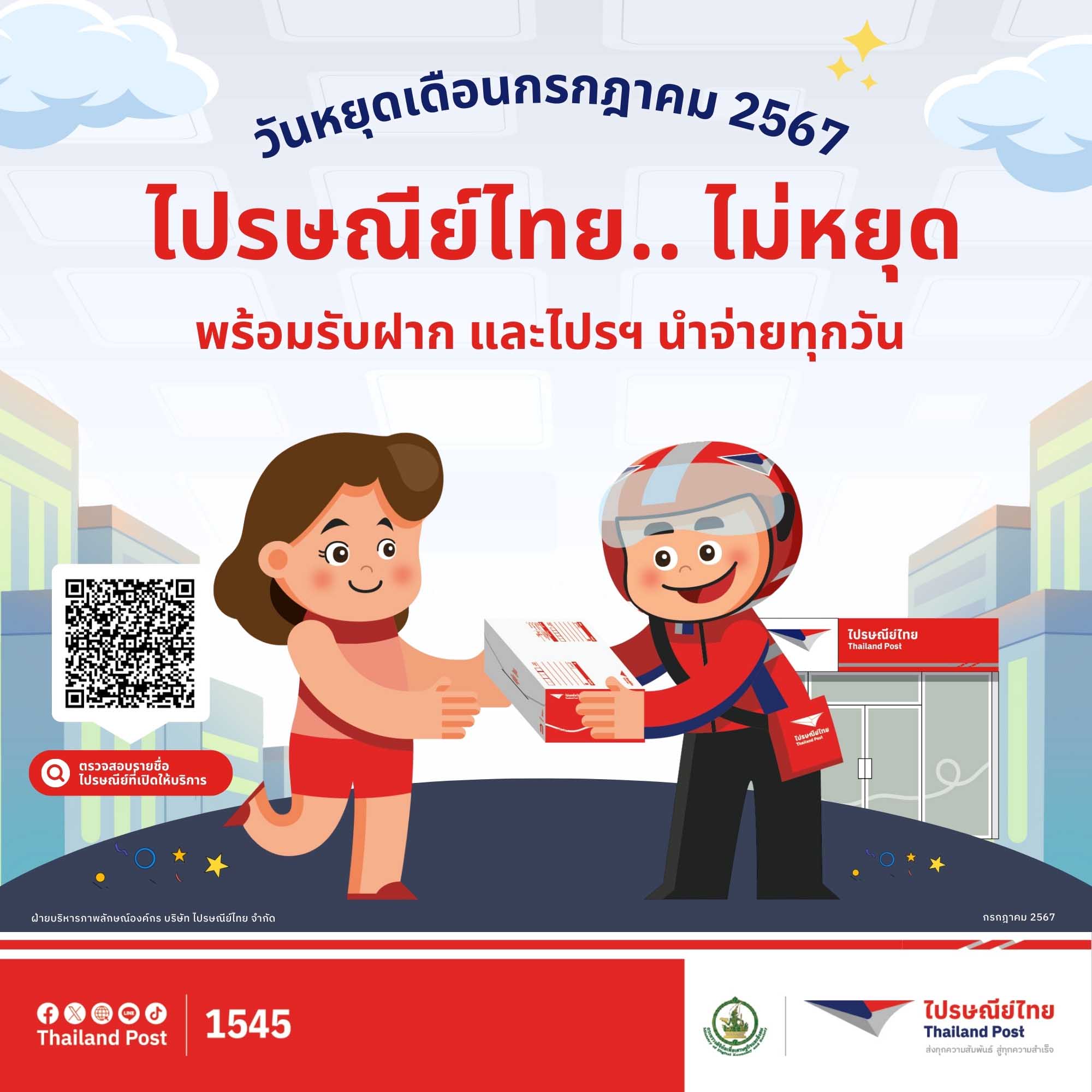 กรุงเทพฯ 24 กรกฎาคม 2567 – บริษัท ไปรษณีย์ไทย จำกัด เปิดให้บริการรับฝากและนำจ่ายปกติ...