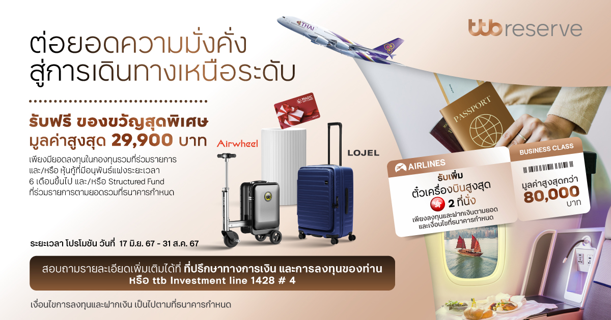 ทีทีบี ชวนลูกค้าต่อยอดความมั่งคั่ง ด้วยผลิตภัณฑ์การลงทุน และบัญชีเงินฝากประจำพลัส 12 เดือน พร้อมรับของรางวัลพิ...