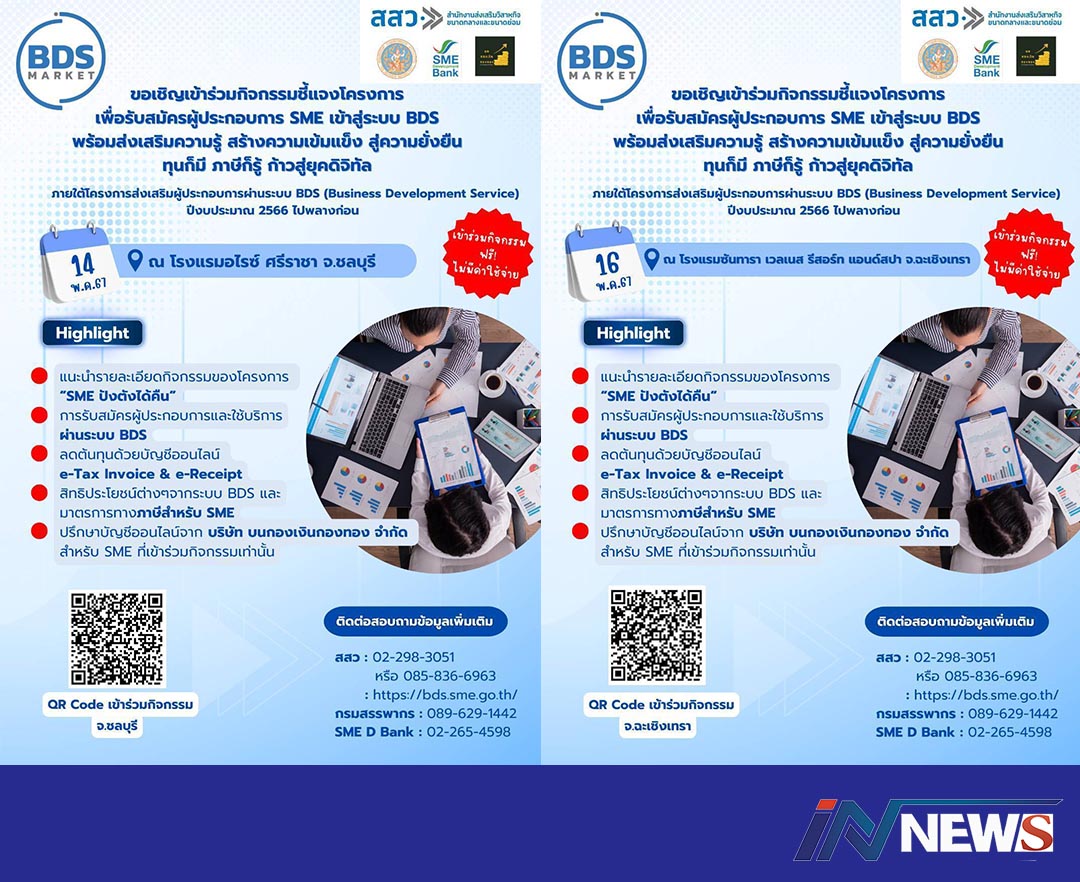 สสว.รุกจัดงานชวน SMEเข้าสู่ระบบBDS ที่ จ.ชลบุรี14พ.ค.และแปดริ้ว16 พ.ค.67