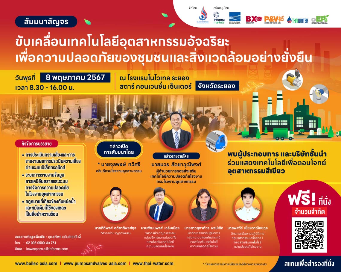 กรุงเทพฯ-ฟังฟรี!งานสัมมนาสัญจร“ขับเคลื่อนเทคโนโลยีอุตสาหกรรมอัจฉริยะ เพื่อความปลอดภัยของชุมชนและสิ่งแวดล้อมอย่างยั...