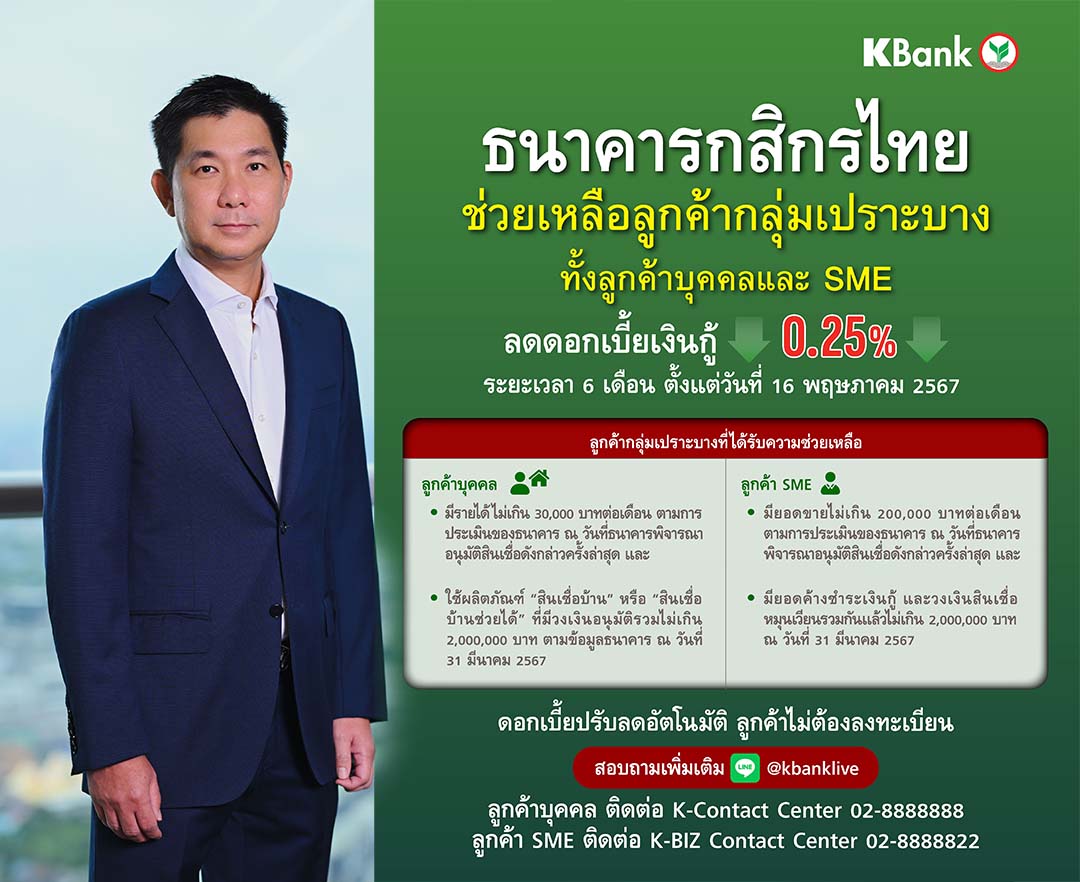 กสิกรไทยประกาศลดดอกเบี้ยช่วยเหลือ ลูกค้ากลุ่มเปราะบาง0.25%ระยะ6เดือน