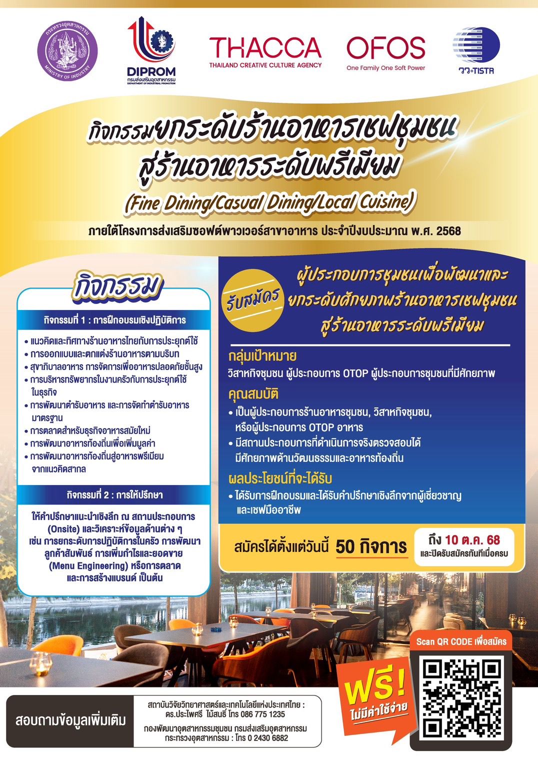 กรุงเทพฯ-กรมส่งเสริมอุตสาหกรรม / วว. / THACCA / OFOS เชิญชวนร่วมกิจกรรมยกระดับร้านอาหารเชฟชุมชนสู่ร้านอาหารระดับพร...