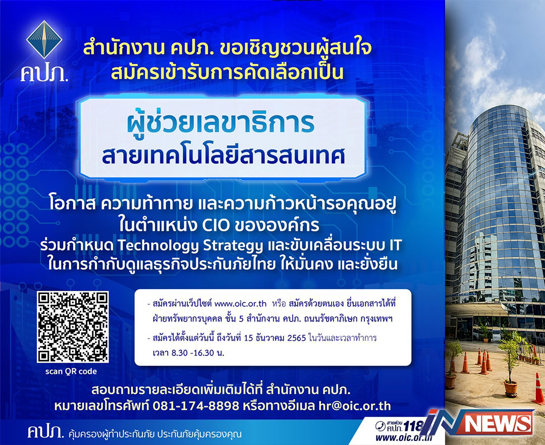 กรุงเทพฯ-คปภ.ประกาศรับสมัคร "ผู้ช่วยเลขาธิการ" สายเทคโนโลยีสารสนเทศ โดยสมัครได้ตั้งแต่วันนี้ -15 ธันวาคม ...