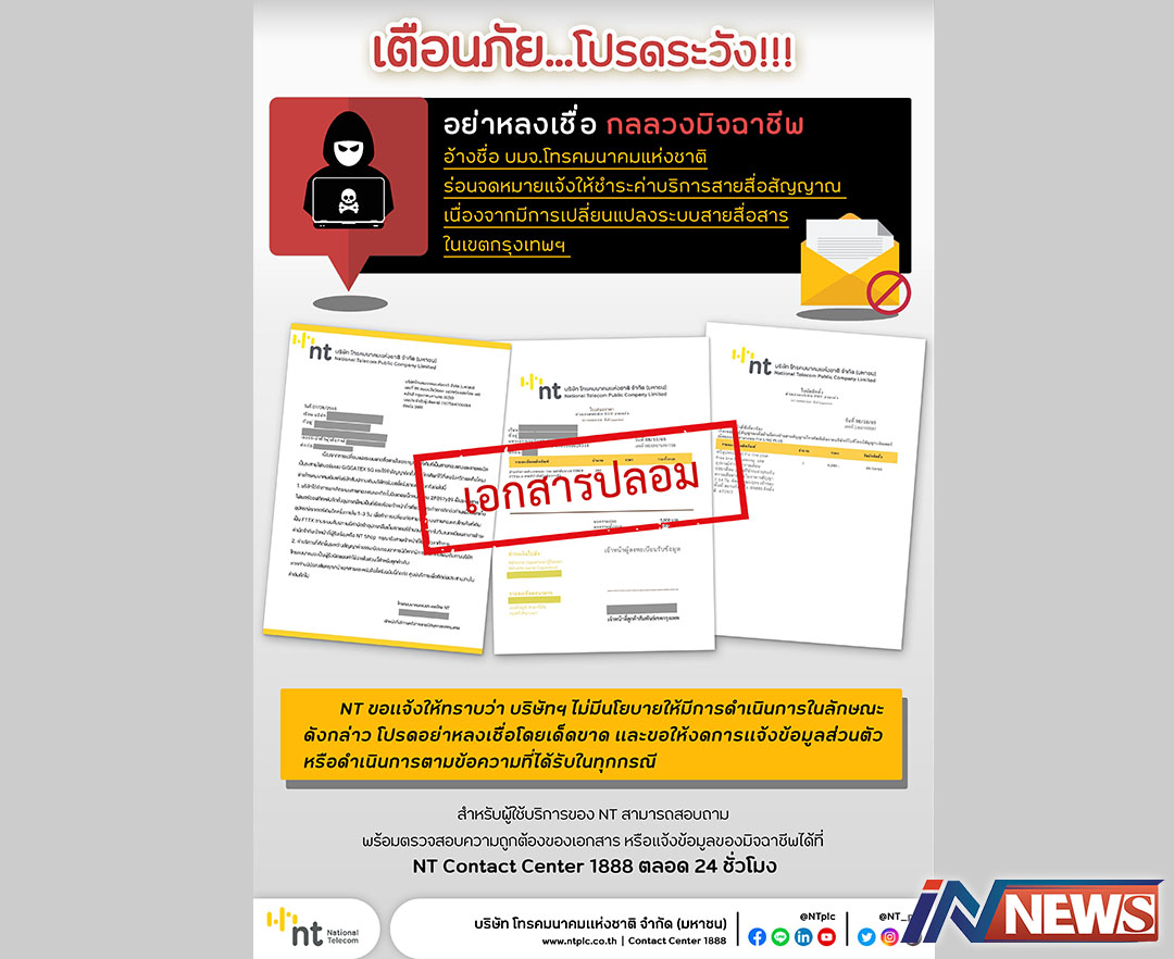 NT เตือนภัยกลลวงมิจฉาชีพรูปแบบใหม่ อ้างชื่อบริษัทส่งจม.แจ้งชำระค่าบริการ