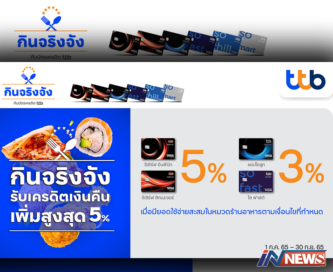 บัตรทีทีบีเอาใจสายกินรับเครดิตเงินคืน เพิ่มสูงสุด5%เจ่ายสะสมตามที่กำหนด
