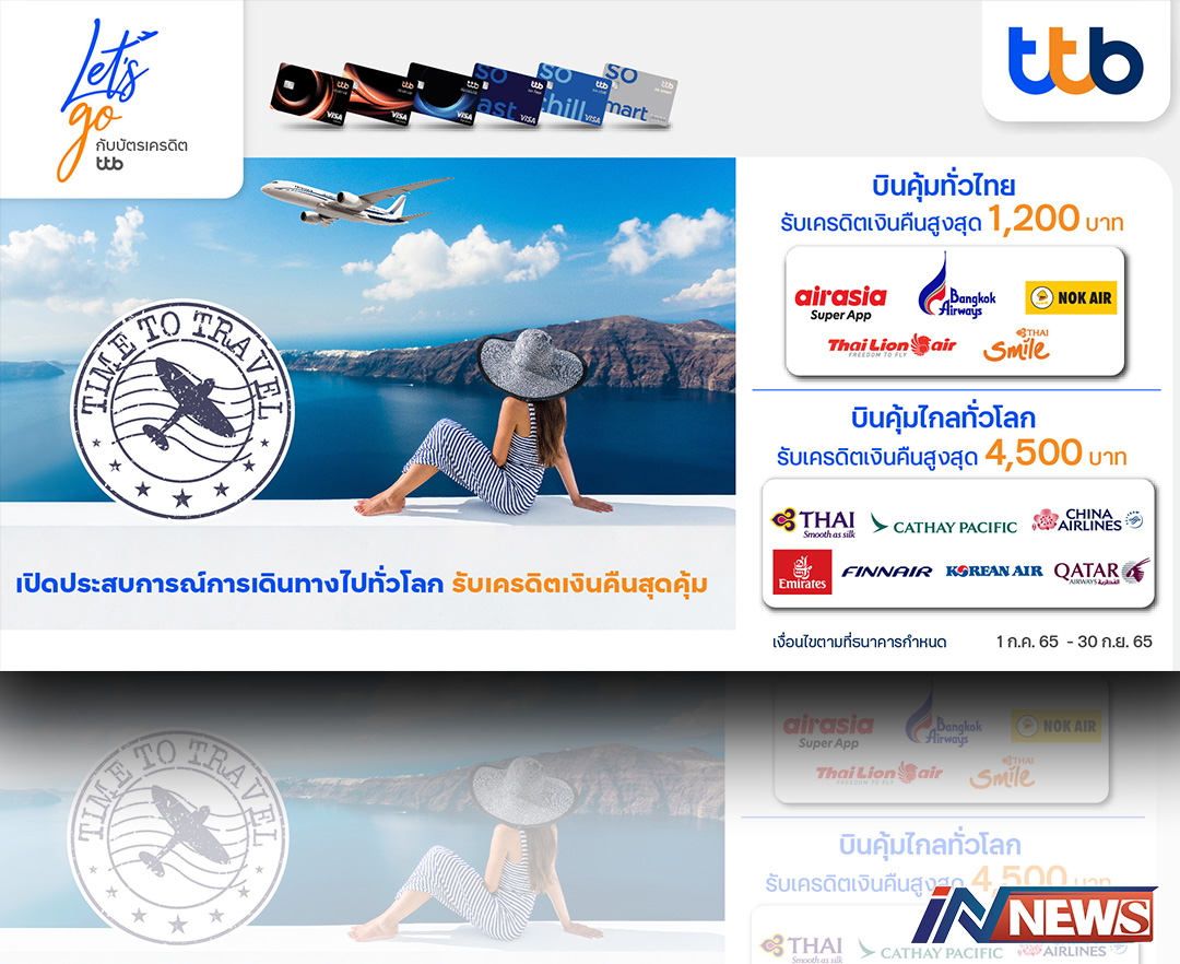 บัตรเครดิต ทีทีบี ชวนเดินทางท่องเที่ยวทั่วไทยและทั่วโลกจับมือ 12 สายการบิน มอบเครดิตเงินคืนสูงสุด 4,...