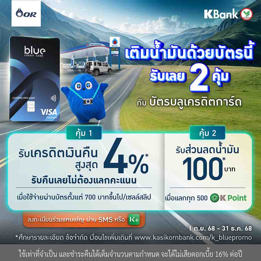 บลูเครดิตการ์ดเติมน้ำมันPTT Station คุ้ม2ต่อรับเครดิตเงินคืน4%/ลด100บ.