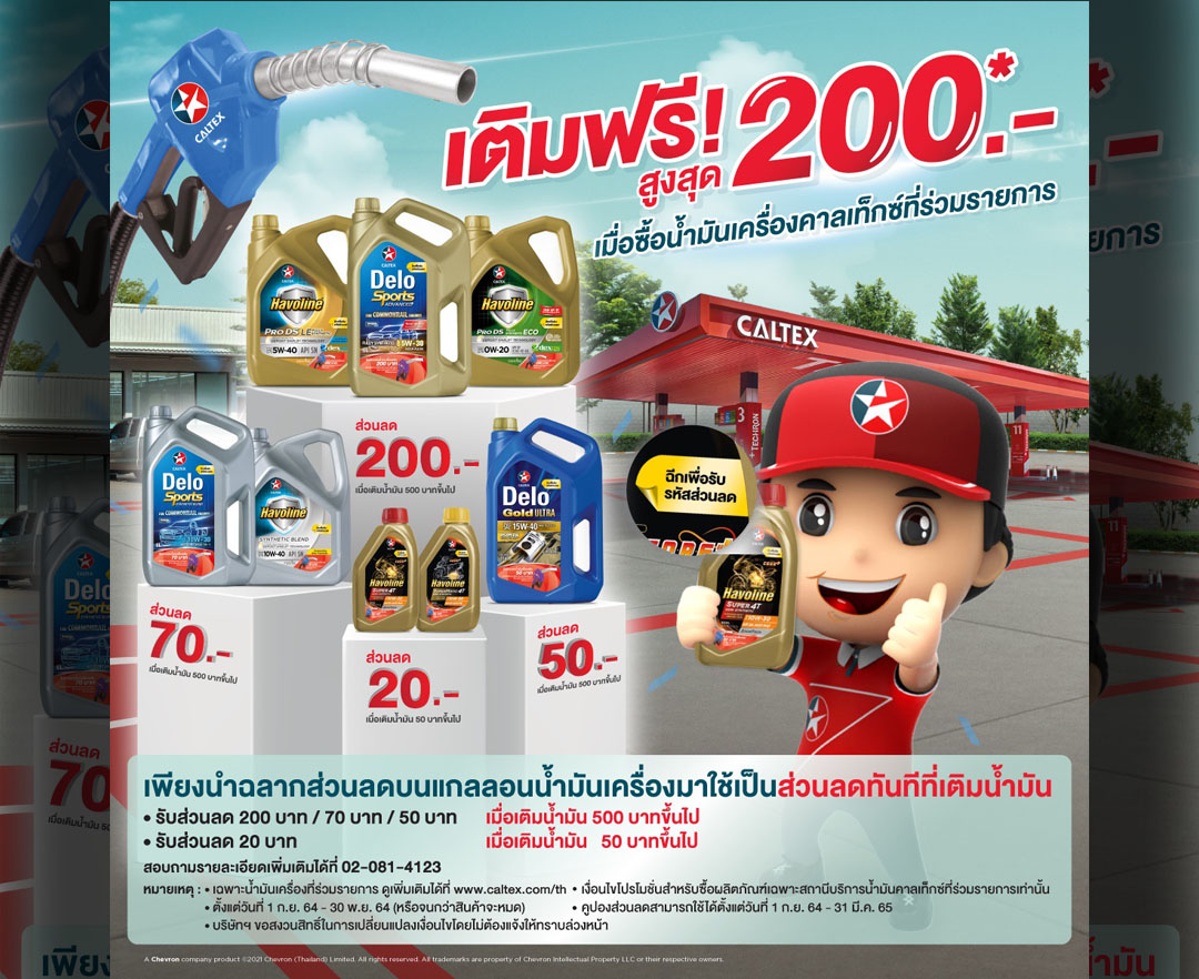 'คาลเท็กซ์'จัดโปรฯเด็ดคลายล็อกโควิด ซื้อน้ำมันเครื่อง-เติมน้ำมันฟรี200บาท