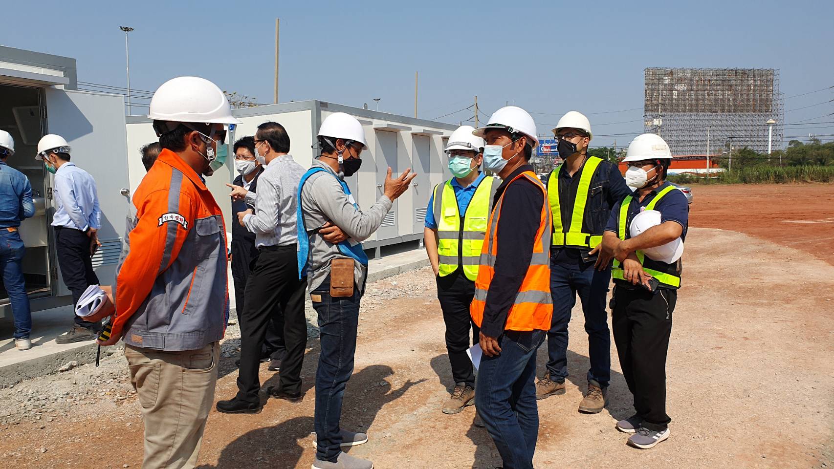 สมุทรสาคร-ประธานสภาอุตสาหกรรมกลุ่มจังหวัดภาคกลางตอนบนพร้อมคณะตรวจความคืบหน้าในการสร้างศูนย์ห่วงใยคนสาคร หรือโรงพยาบาลสนา...
