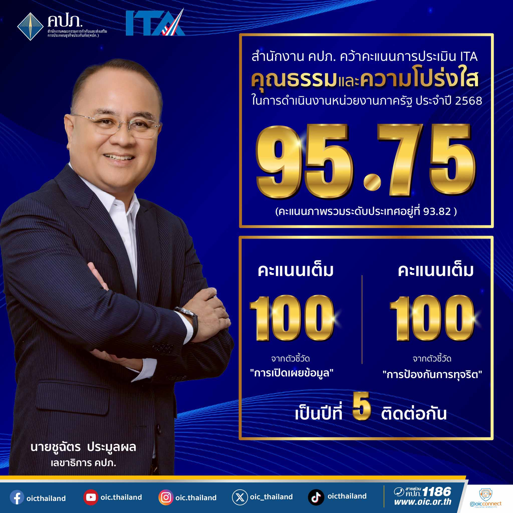 คปภ.ประเมิน ITAปี68ได้เต็ม100คะแนน ตัวชี้วัด'เปิดเผยข้อมูล-ป้องกันการทุจริต'
