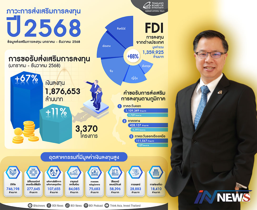 เผยยอดลงทุนปี2568พุ่ง1.8ล้านล้านบาท พลิกโฉมศก.ไทยสู่ฐานนวัตกรรมอนาคต