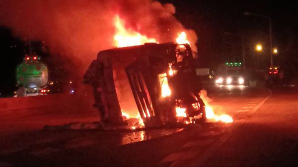 รถพ่วง18ล้อลงเขาเบรกแตกพลิกคว่ำ ไฟลุกไหม้ลูกดับ-พ่อแม่บาดเจ็บสาหัส