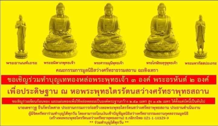 ฉะเชิงเทรา-มูลนิธิสว่างศรัทธาธรรมสถาน(วิหารแปดเซียนแปดริ้ว)ขอเชิญทำบุญเททองหล่อพระ พระพุทธเจ้า 3 พระองค์ พระอัครสาวก 2 อ...