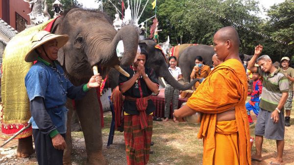 สำนักสงฆ์ป่าอาเจียงตักบาตรเทโวโรหณะ ชูสีสันนำช้างแสนรู้30ตัวใส่บาตรทำบุญ